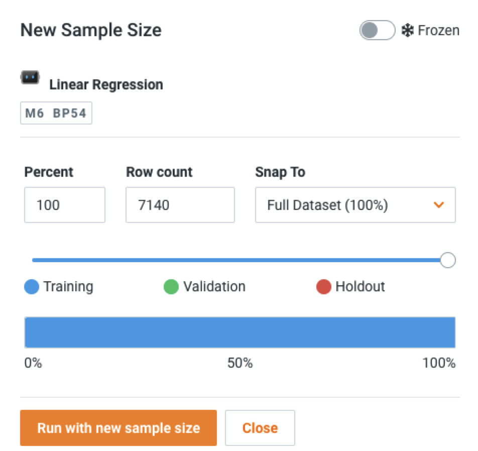 To generate a single coefficient for the PriceActual variable, use a different model from the model Leaderboard. Find the initial Linear Regression blueprint and retrain it on 100% of the data using the Holdout partition.