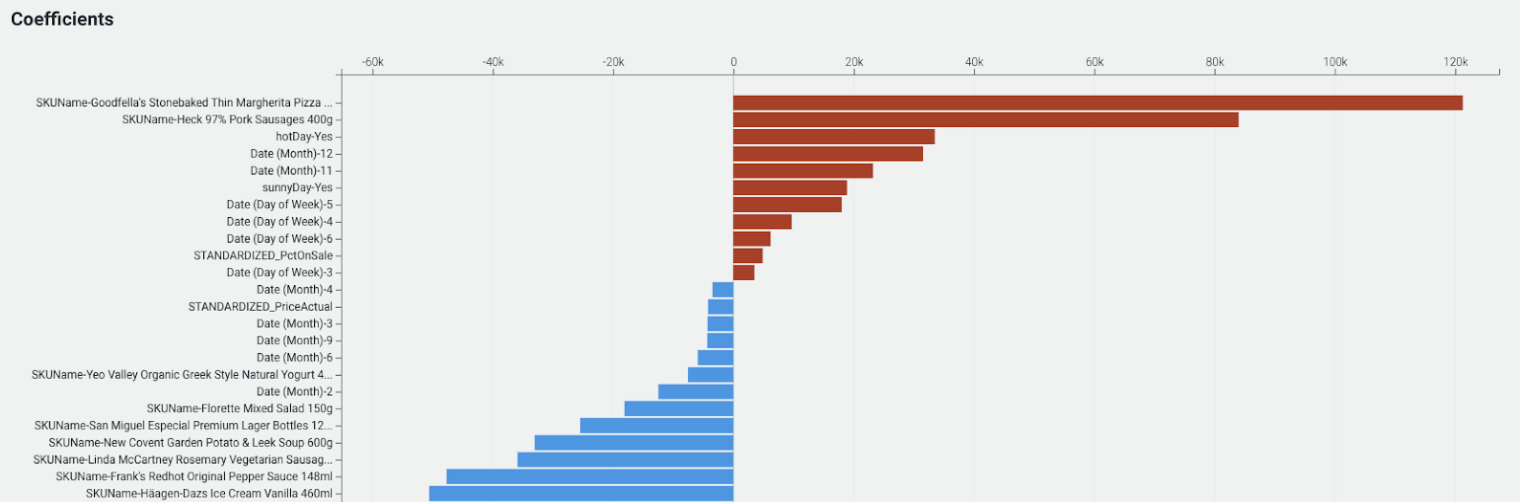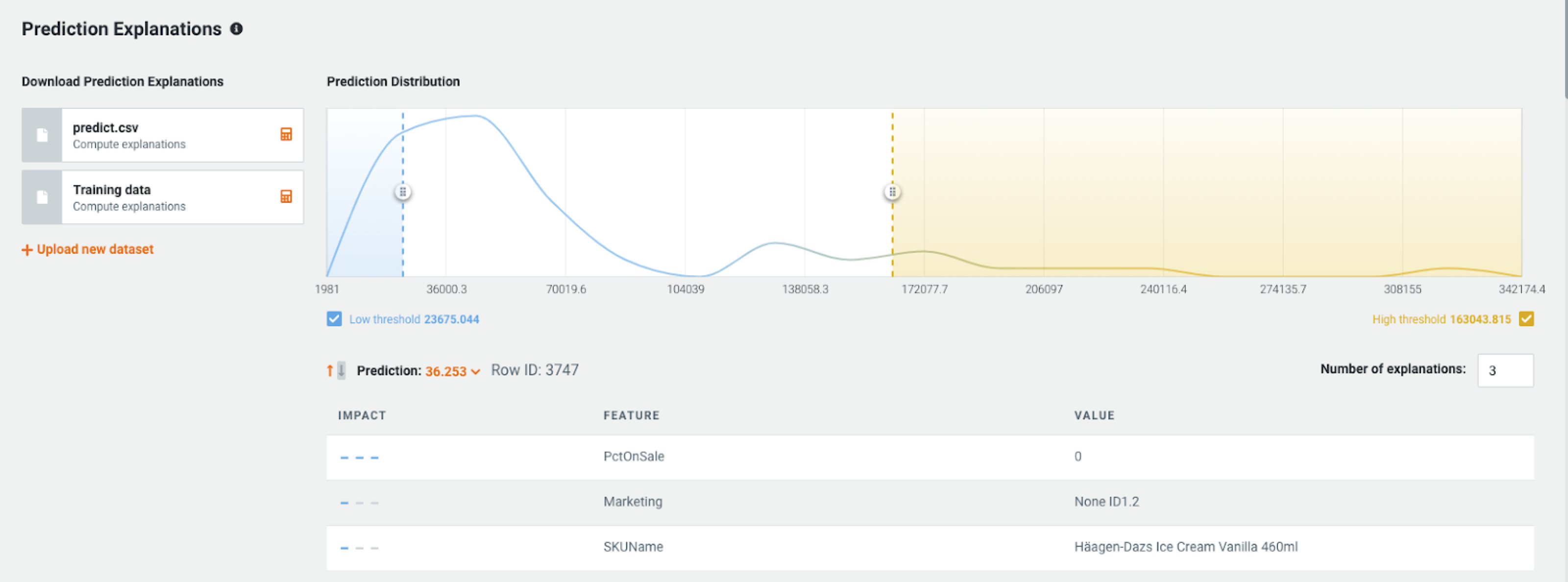 Prediction Explanations (XEMP in this example) are extremely useful to analysts to aid in answering “Why?” questions around their product or category. In the below example we can see a product with low expected sales. The top three reasons given show that this is because the item is not on sale and has no marketing activity to promote it. This is an ice cream, so there is likely a discounted brand with the same flavor close by, altering consumer decision making.
