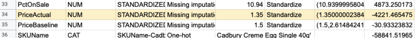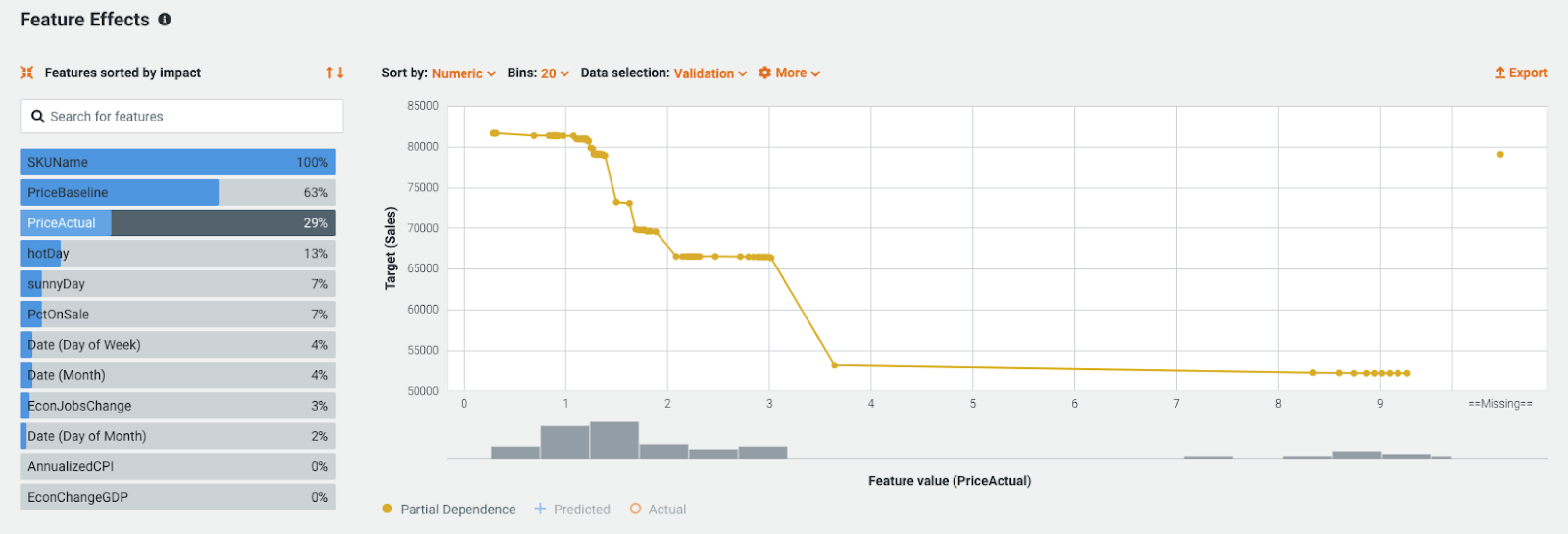 For this use case, the partial dependence plot shown in Feature Effects may be the most important model insight. In this case, the plot shows impact of price increases on sales at all price values. Rather than considering a single coefficient, this acknowledges that not all units of price increase have the same impact on sales. For example, in this graph a price increase from $2.10 to $3 has almost no effect on sales, but increasing the price beyond $3 has a significant negative impact.