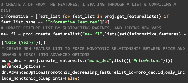 This use case removes Year and keeps all other variables. This use case also creates a feature list of variables that should always have a negative relationship with sales (monotonically decreasing and uses its relationship to inform model training. In this case, the feature list enforces the idea that sales should always decrease as price increases.