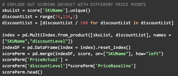 With an understanding of how prices and other factors impact sales, you can find an optimal price that maximizes revenue. To do so, you can simulate many possible pricing scenarios for the products you want to analyze. The starting data contains one row for each product on an upcoming date, providing as much confounding information possible. The price to start is the currently planned price.
