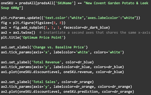 The final output shows a new optimal price point for each product under the column PriceActual_y. Note that Heck 97% Pork Sausages are actually being discounted too much: