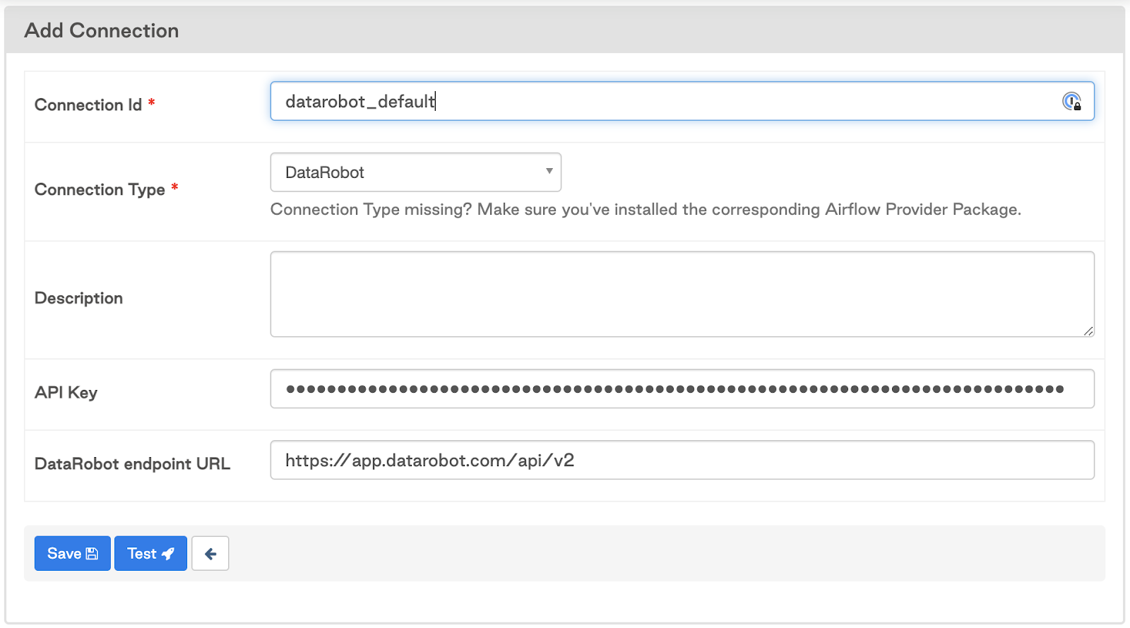テストをクリックして、AirflowとDataRobotの間にテスト接続を確立します。
