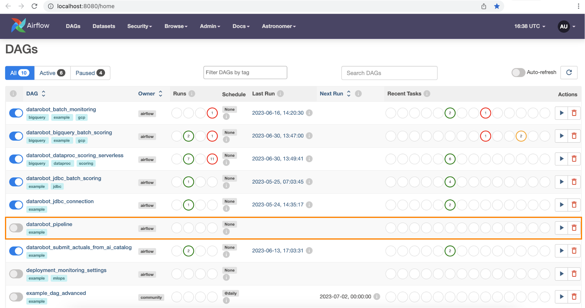 datarobot_pipeline_dag.pyAirflow DAG(またはdatarobot_provider/example_dagsディレクトリ全体)をプロジェクトにコピーします。 -