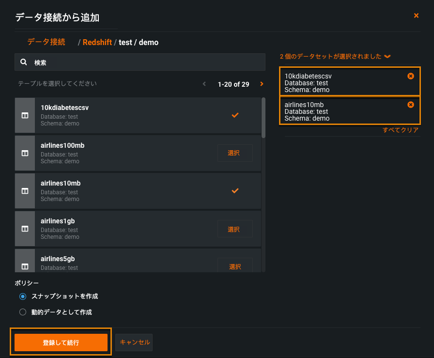 高速登録では、データセット全体ではなく、最初のN行を指定して登録することで、大きなデータセットをAIカタログにすばやく登録することができます。 これによりテストと特徴量探索に使用するデータへの高速アクセスが可能になります。