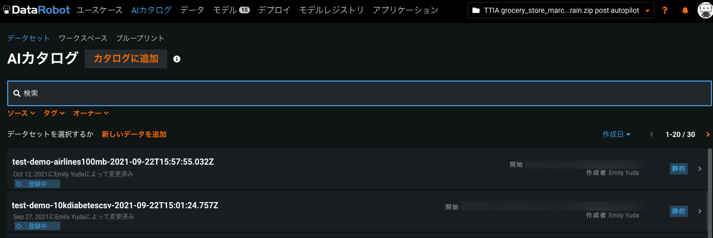 DataRobotウィンドウの上部にあるAIカタログをクリックします。