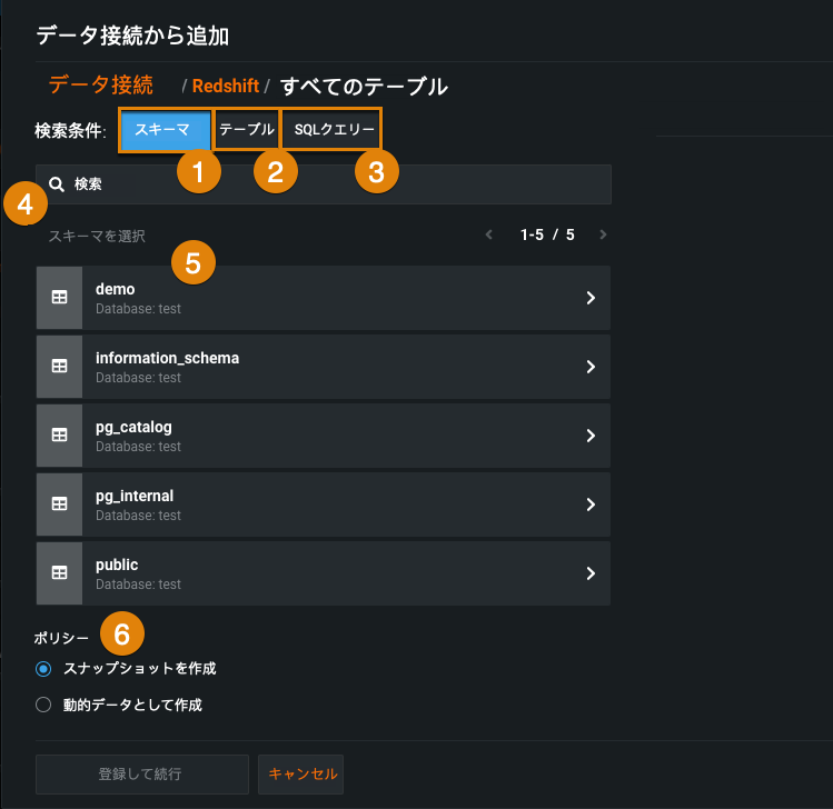 要素 説明 1 スキーマ スキーマを選択して、データベース接続に関連付けられたすべてのスキーマをリストします。 表示されたリストからスキーマを選択します。 DataRobotはそのスキーマを構成するすべての表が表示されます。 データソースとして追加する各表で選択をクリックします。 2 表 表を選択して、すべてのスキーマにわたるすべての表の一覧を表示します。 データソースとして追加する各表で選択をクリックします。 3 SQLクエリー SQLクエリーでプロジェクトのデータを選択します。 4 検索 データソースをフィルターする方法(スキーマ、テキスト、またはSQLクエリー)を選択したら、テキスト文字列を入力して検索します。 5 データソースリスト 追加するデータソースで選択をクリックします。 選択された表(データセット)が右に表示されます。 1つのデータセットを削除するには、 xをクリックします。すべてのエントリを削除するには、すべてクリアをクリックします。6 ポリシー ポリシーの選択: - スナップショットの作成:DataRobotがデータのスナップショットを取得します。