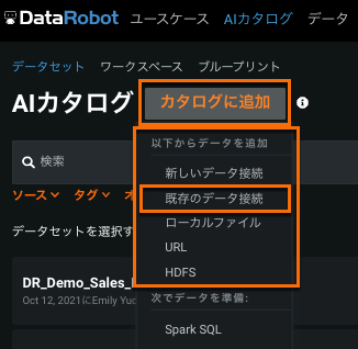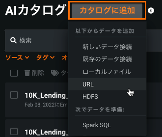 AI Catalogで、 カタログに追加をクリックしてデータソースを選択します。 高速登録は、新しいデータ接続、既存のデータ接続、またはURLからデータセットを追加する場合にのみ使用できます。