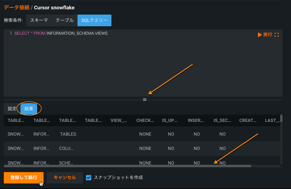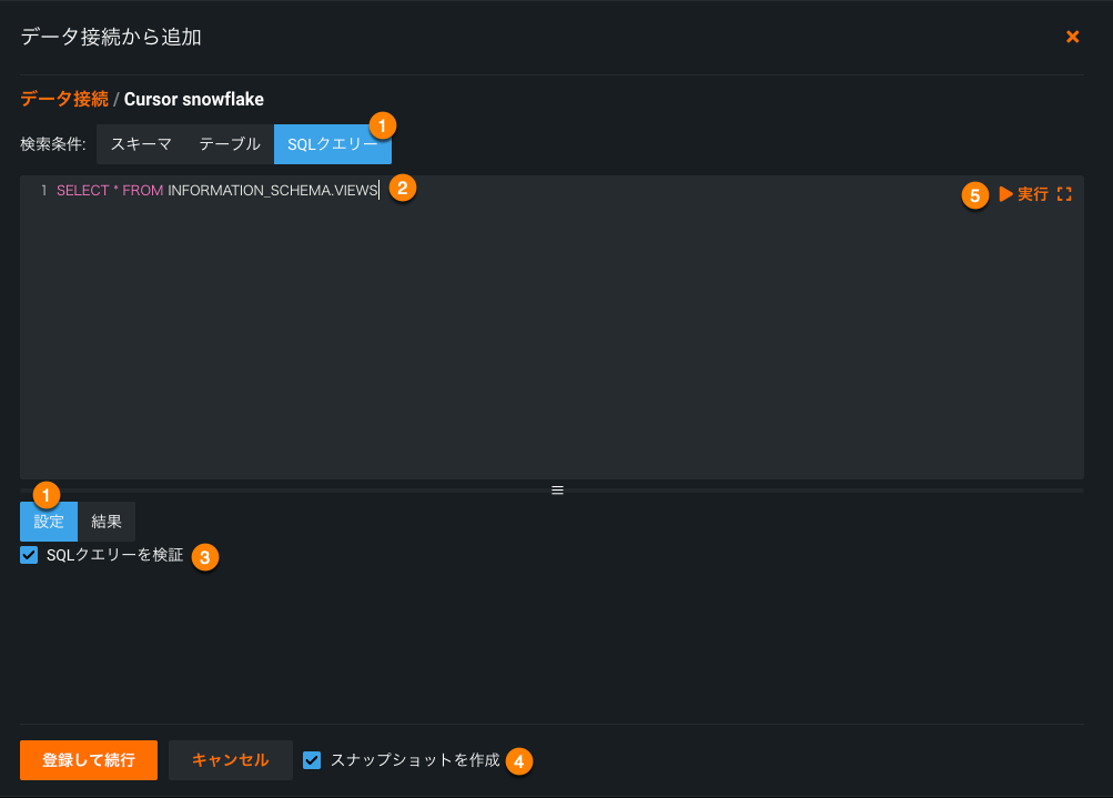 複雑なクエリーの場合、検証に長い時間がかかることがあるため、構文検証を無効にすることが有効な場合もあります。 検証を無効にすると、結果は表示されません。 クエリーの実行をスキップして、登録に移動できます。