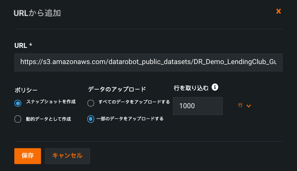 インポート方法は、従来のエントリーおよびカタログエントリー両方で同じであり、ローカルファイル、HDFS、URL、またはJDBCデータソースを介してインポートします。 しかしカタログの場合、データセットをSparkとアンサンブルすることによって追加することもできます。 カタログ経由でアップロードする場合、(マテリアライズされたアセットに対して)EDA1が実行され、その結果は後で再利用できるように保存されます。 マテリアライズされていないアセットの場合、DataRobotはデータのアップロードとサンプルが行われますが、後で再利用するための結果の保存は行いません。 さらに、時系列プロジェクトで使用するカレンダーをアップロードすることや、個人データの検出を有効にすることもできます。