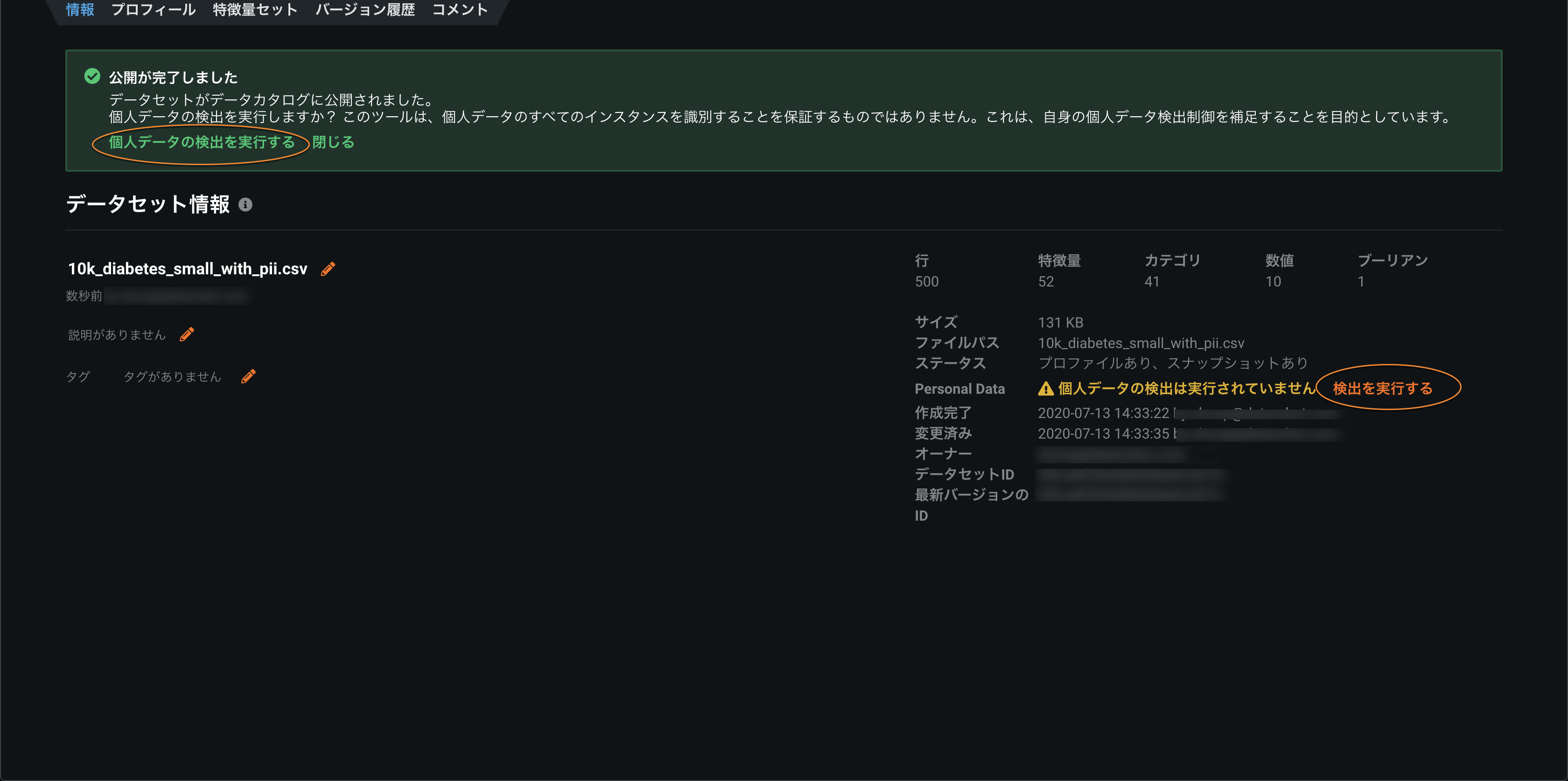 AIカタログのデータセットで個人データ検出を実行するには、情報ページに移動して、データセットの正常なパブリッシュを示すバナーで個人データの検出を実行するをクリックします。