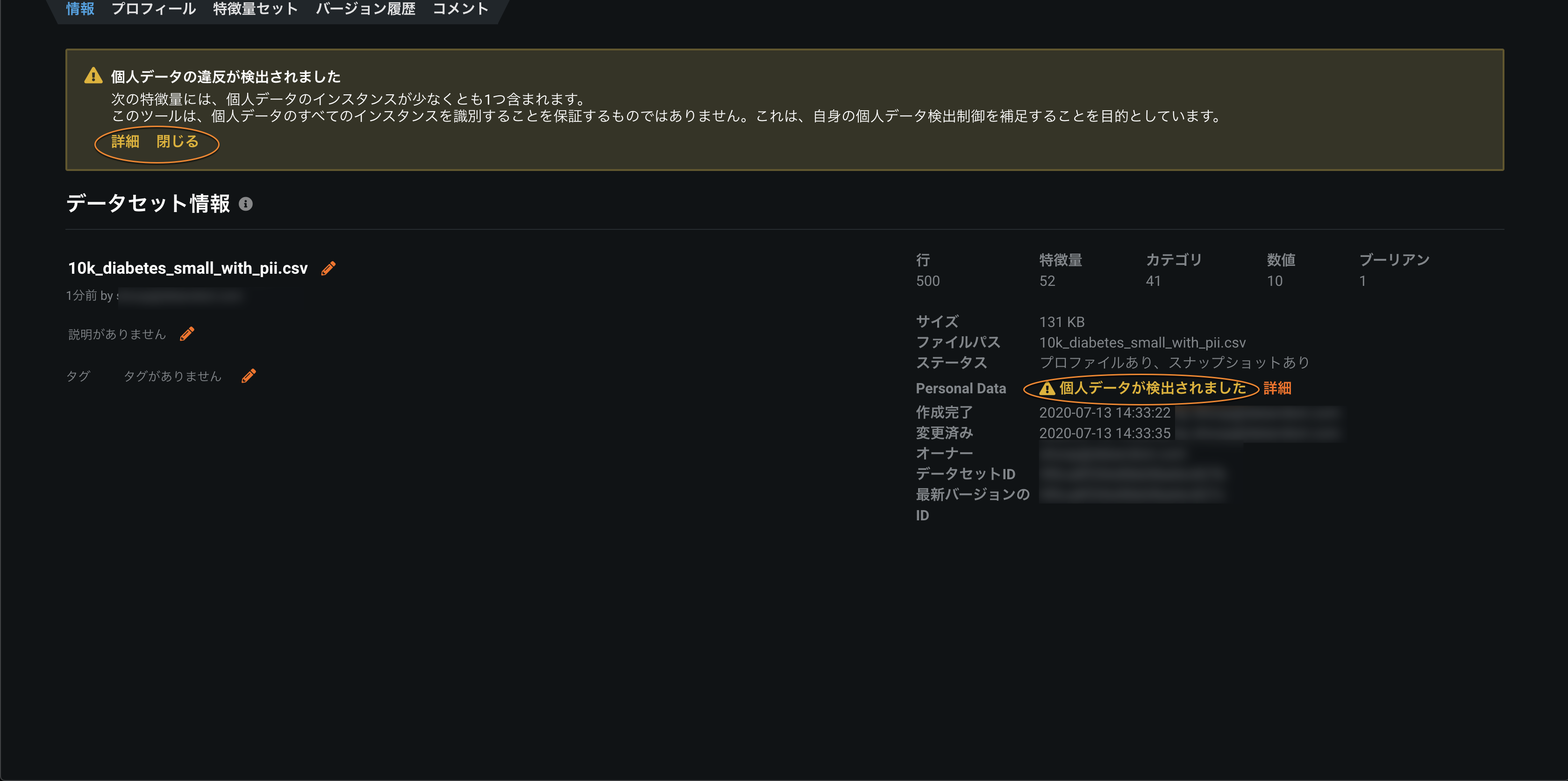 データセット内で個人データが検出されると注意メッセージが表示されます。 詳細をクリックすると、検出された個人データに関する詳細情報が表示されます。却下をクリックすると、注意が消えて再度表示されなくなります。