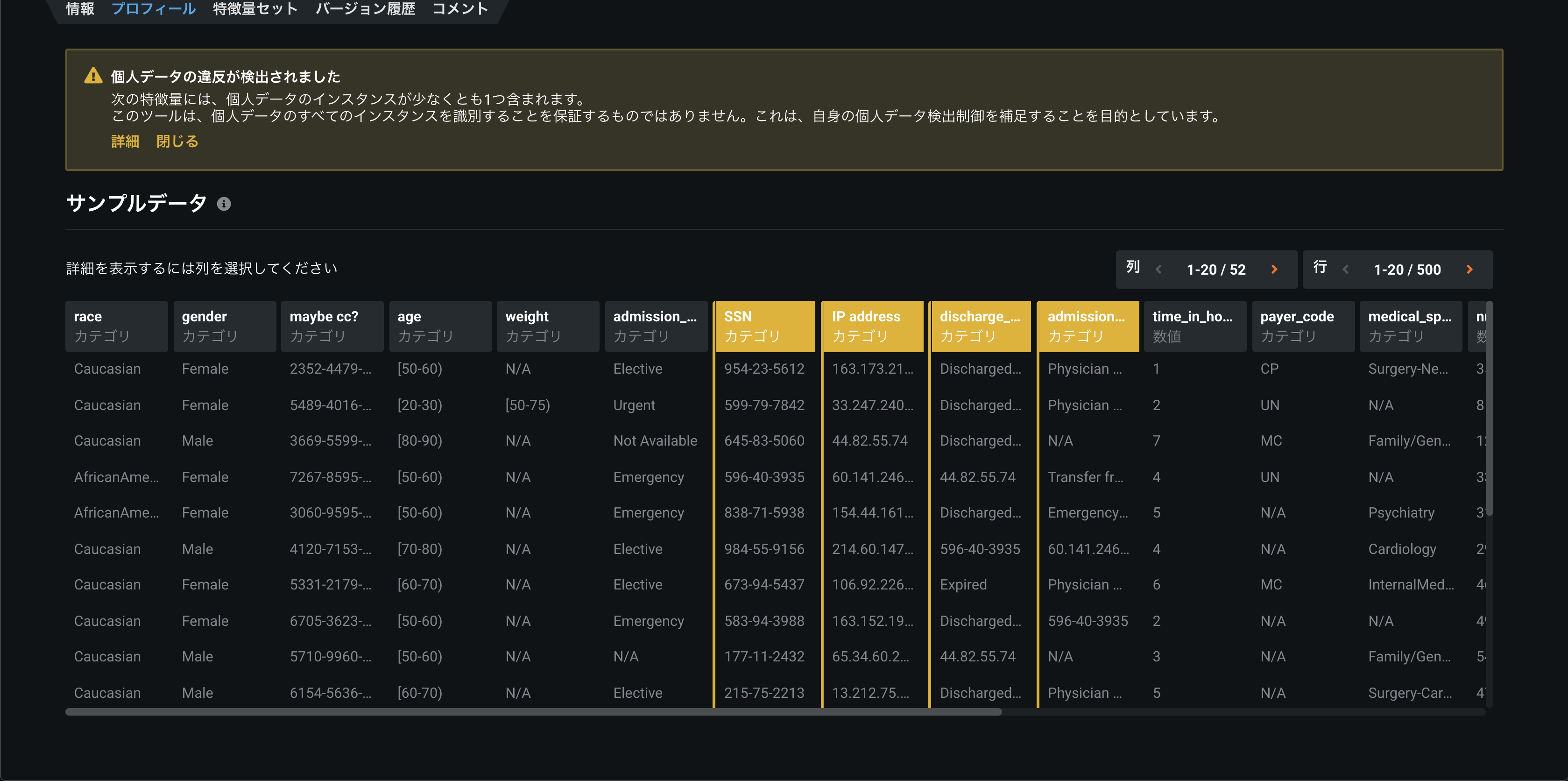 データセットがAIカタログを通して取り込まれた後、各特徴量に個人情報が存在するかどうかをチェックするオプションがあります。 その結果、データセットのすべてのセルを、この種の情報を識別するためにDataRobotが開発したパターンと照合する処理が行われます。 見つかった場合、AIカタログの情報とプロフィールページに警告メッセージが表示され、各特徴量で検出された個人情報の種類を知らせるとともに、今後どのように進めるかを決めるのに役立つサンプル値を提供します。 さらに、DataRobotは新しい特徴量セットを作成します。これは有用な特徴量と同等ですが、個人情報を含む特徴量がすべて削除されています。 新しいセットの名前は有用な特徴量 - 個人情報を削除です。