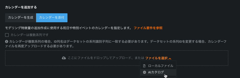 - アップロード方法のいずれかを使用して、カタログに追加ボタンを使ってカタログに直接アップロードする。 ローカルファイルとしてアップロードされたカレンダーは、自動的にAIカタログに追加され、共有やダウンロードが可能になります。