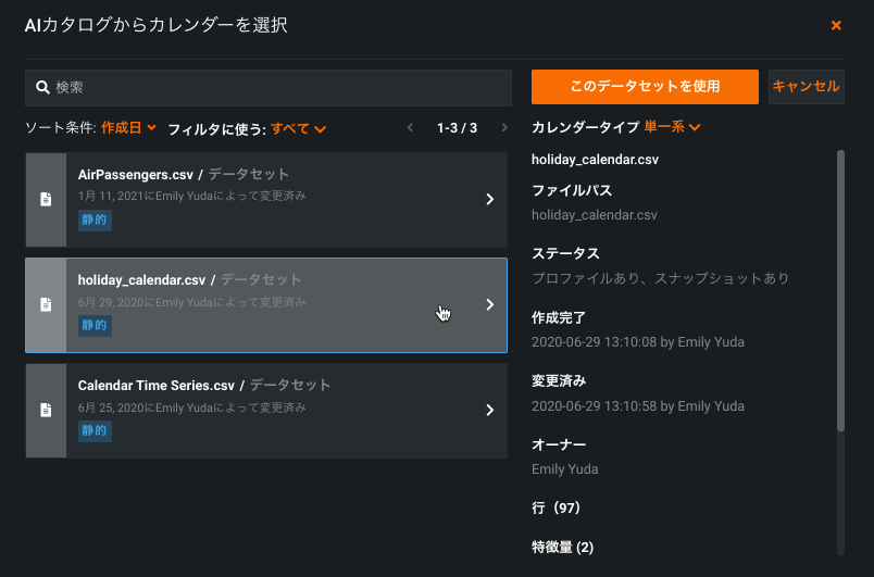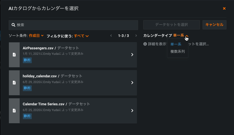 データセットのコンテンツに基づいて決定された使用可能なカレンダーがモーダルに一覧表示されます。 ドロップダウンを使用して、リストをタイプでソートします。
