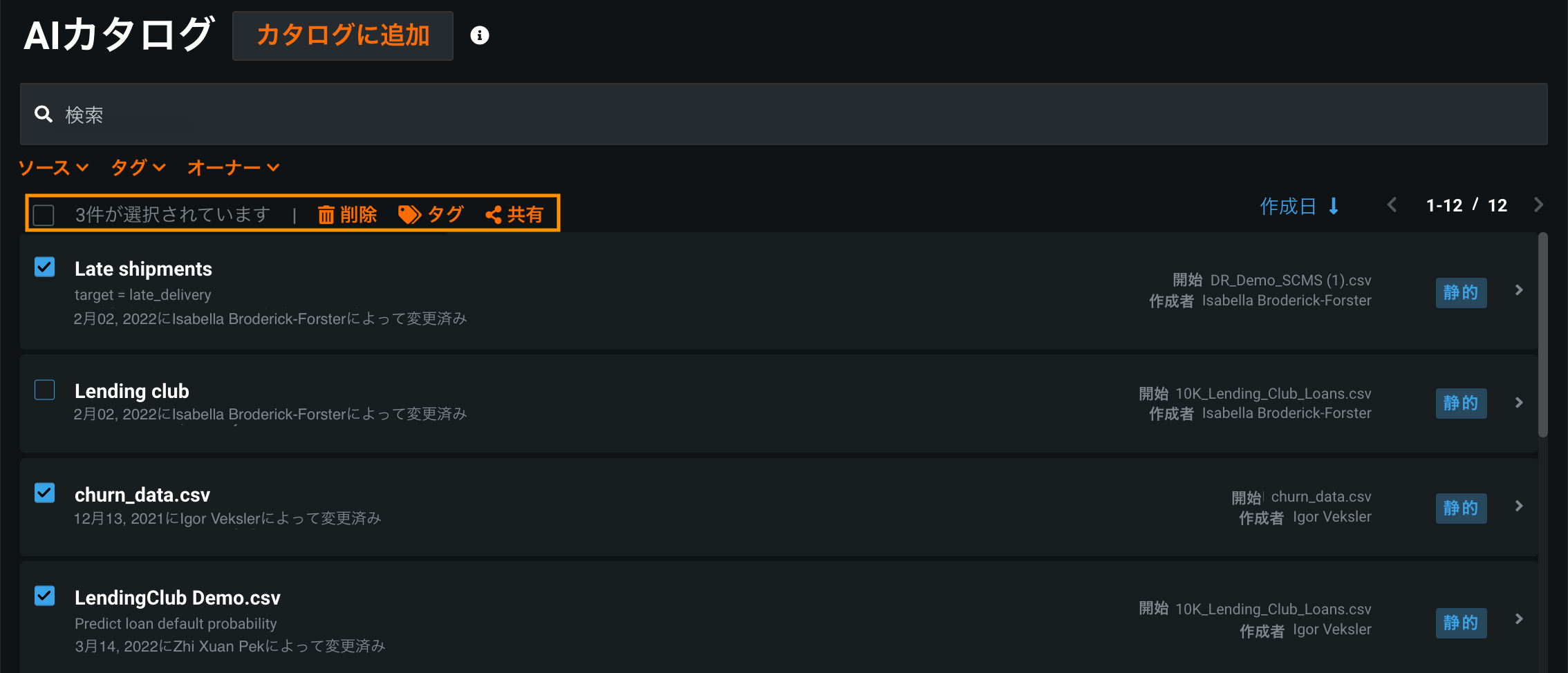 AIカタログの一括アクション機能を使用して、複数のデータセットを一度に共有、タグ付け、または削除できます。 管理するアセットの横にあるボックスを選択することから始めます。上部の一括アクションを有効にするには、少なくとも1つのアセットを選択します。 カウンターには、アクティブに選択されているアセットの数も表示されます。