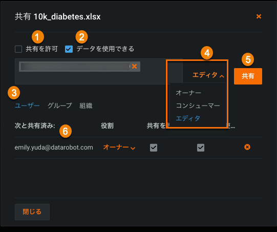 | 2 | データを使用できる | 共有しているユーザーはデータを使用できます。 データの使用方法は、ロールによって異なります。 |
