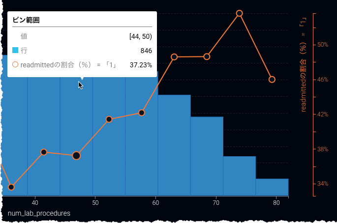 この例では、44から49.999999の検査手順を持つ人物が846名います。 円によって表現される平均ターゲット値(この場合、再入院の割合)は37.23%です。 (オレンジの点はヒストグラムの右軸に対応します。)