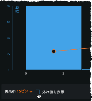 外れ値を表示するためにX軸スケールと箱ひげ図の圧縮が変化することに注意してください。 外れ値を記録する行が少なくなる傾向があるため(これが外れ値となる理由です)、青いバーが表示されない場合があります。 その列にカーソルを合わせると、実際の行数を示すツールチップが表示されます。