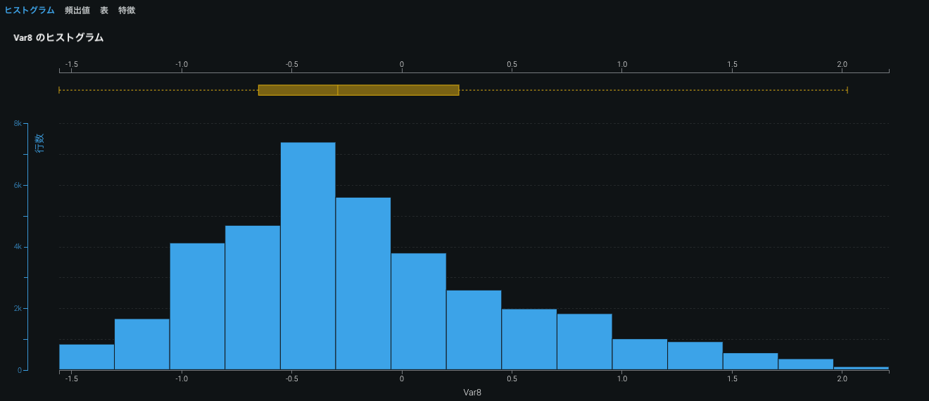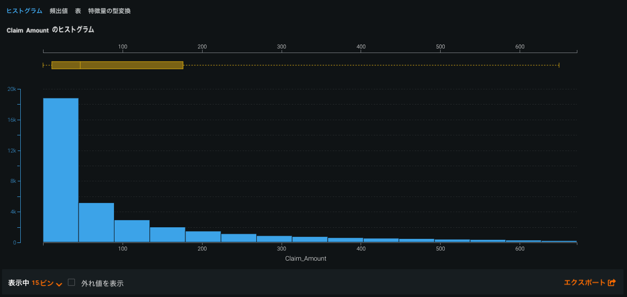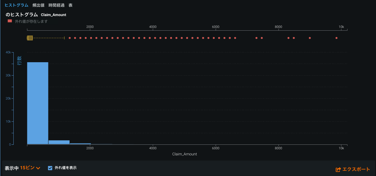 サンプル平均の一番端にある観測ポイントである外れ値は、データの変動性の結果であることがあります。 外れ値はデータエラーを表すことがあります。その場合、ヒストグラムから外れ値を除外することが推奨されます。 外れ値検知(ヒューリスティックの組み合わせを使用してEDA1の一部として実行されます)は単なるヒストグラム視覚化ツールなので、モデリング処理には影響しません。