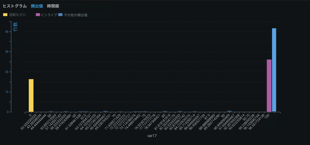 頻出値チャートでは、共通値に加えて、インライア、偽装欠損値、および過剰なゼロが表示されます。