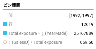 特徴量の値と表示はEDA1とEDA2で異なることがあります。EDA1の場合、チャートではデータセットからのデータがそのまま表現されます。 ターゲットと構築モデルを選択した後、ホールドアウトや欠損値などが原因で、データの計算において行数が少なくなることがあります。 また、EDA2 の後、平均ターゲット値が表示されます。(EDA1では計算されません。)