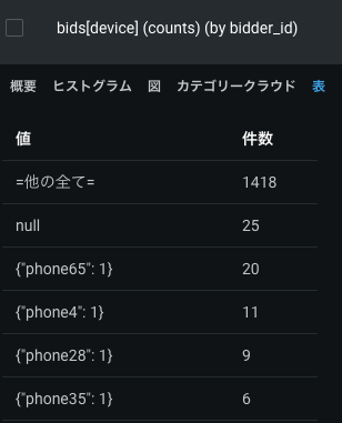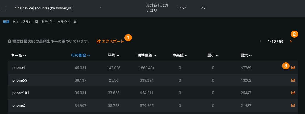 概要タブには、特徴量の最も頻繁に使用される上位50のキーが表示されます。 各キーには、キーが平均値、標準偏差、中央値、最小値、および最大値に現れる行のパーセンテージが表示されます。キーは、このいずれかのフィールドで並べ替えることができます。 その他のタイプの同じ情報のほとんどは、データページの列で表示されますが、集計されたカテゴリー型特徴量の場合、個々の各キーには、これらのフィールドに独自の値があります。