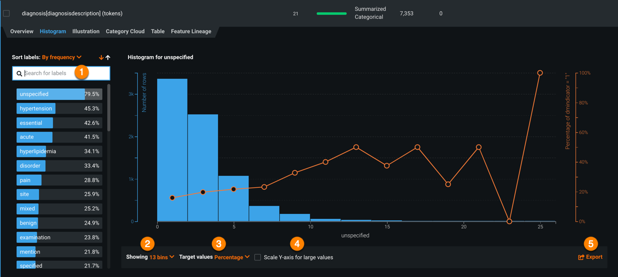 このタブのほとんどの機能は、ヒストグラムの操作に関する上記のセクションで説明されている機能と同じですが、この特徴量の型独自の違いがいくつかあります。 このタブに表示されるヒストグラムは、特徴量自身ではなく、特徴量の個々のラベル(キー)に対応しています。 キーのリストは、データベースの行での発生率またはアルファベット順に並べ替えることができます。