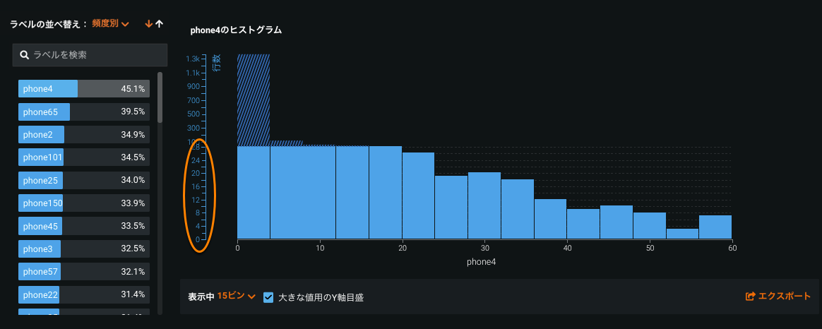 | 2 | 表示中 | ビンの分布を変更します。 表示するビンの数を選択します。 |