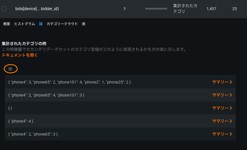 例示タブには、集計されたカテゴリー型データを特徴量として表す方法が示されます。 たとえば、上記の説明のように、次の図の値列には、5つの集計されたカテゴリー型特徴量が(ランダムに選択された)JSONディクショナリ形式で表示されています。