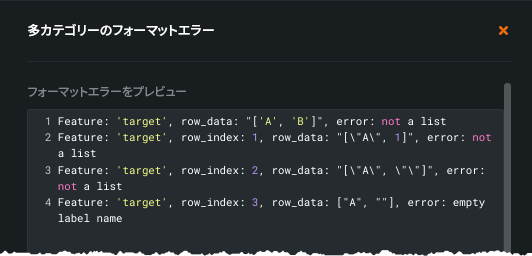 データ品質ツールにエラーの選択が報告されます。 特徴量に多カテゴリー形式エラーがある場合、多カテゴリーとして検出されません。 エラーの詳細については、評価ログを確認してください。