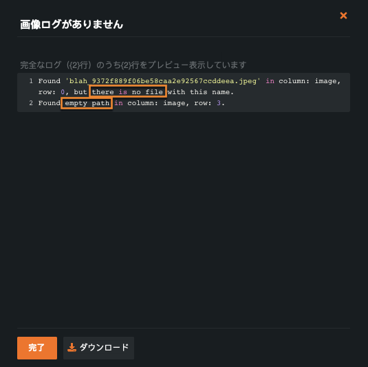 この例では、行1は、アップロードされたファイル(1)に存在しない参照されたファイル名をレポートします。 行2は、行に画像パスがないことをレポートします(2)。 ログには、問題の性質と問題が発生した行の両方が含まれます。 ログには最大100行のプレビューが表示されます。ダウンロードを選択すると、ログファイルがエクスポートされ、追加の行を表示できます。