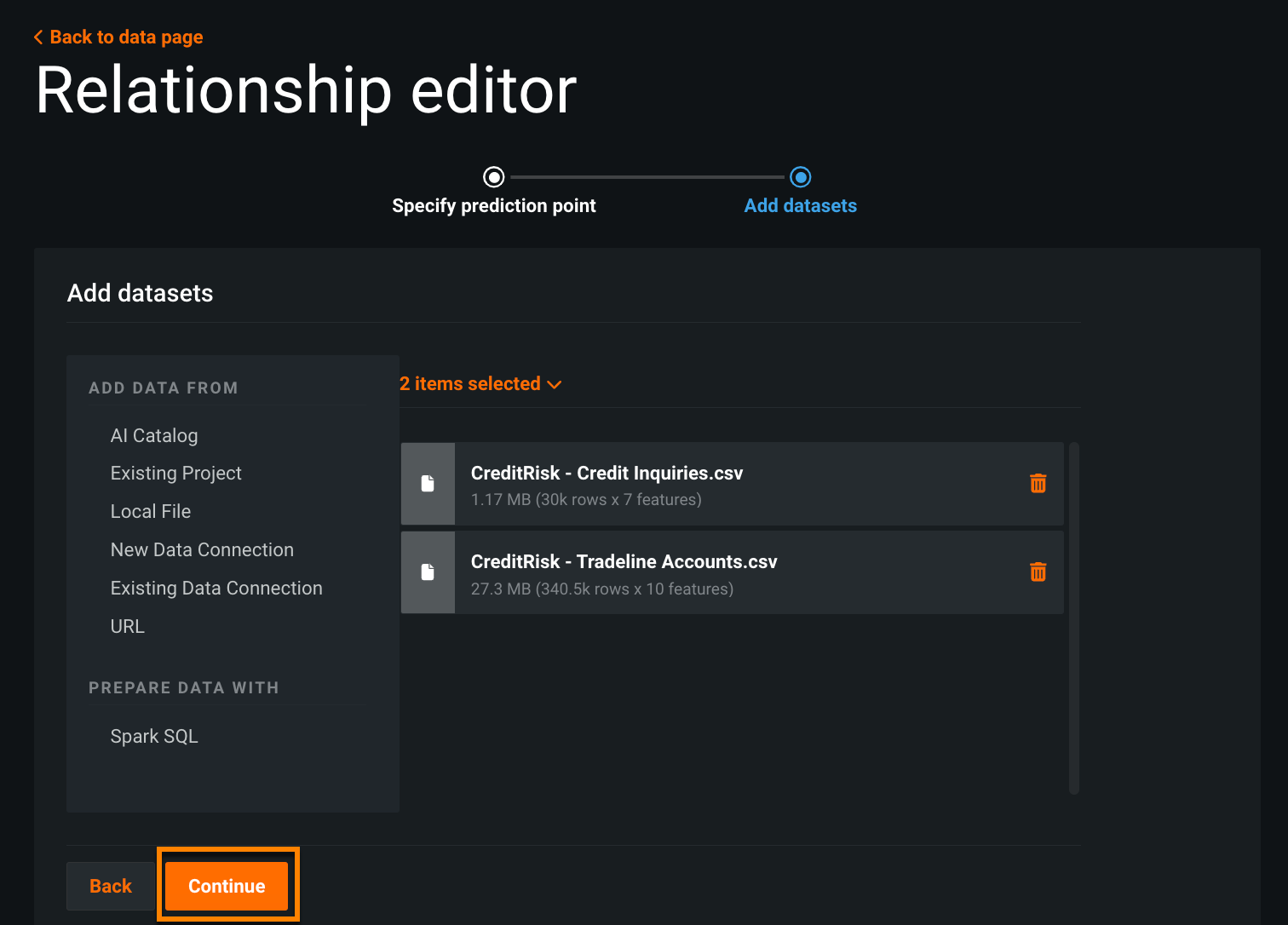 データセットをAIカタログにアップロードしたら、作成したプロジェクトのプライマリーデータセットにセカンダリーデータセットを追加できます。