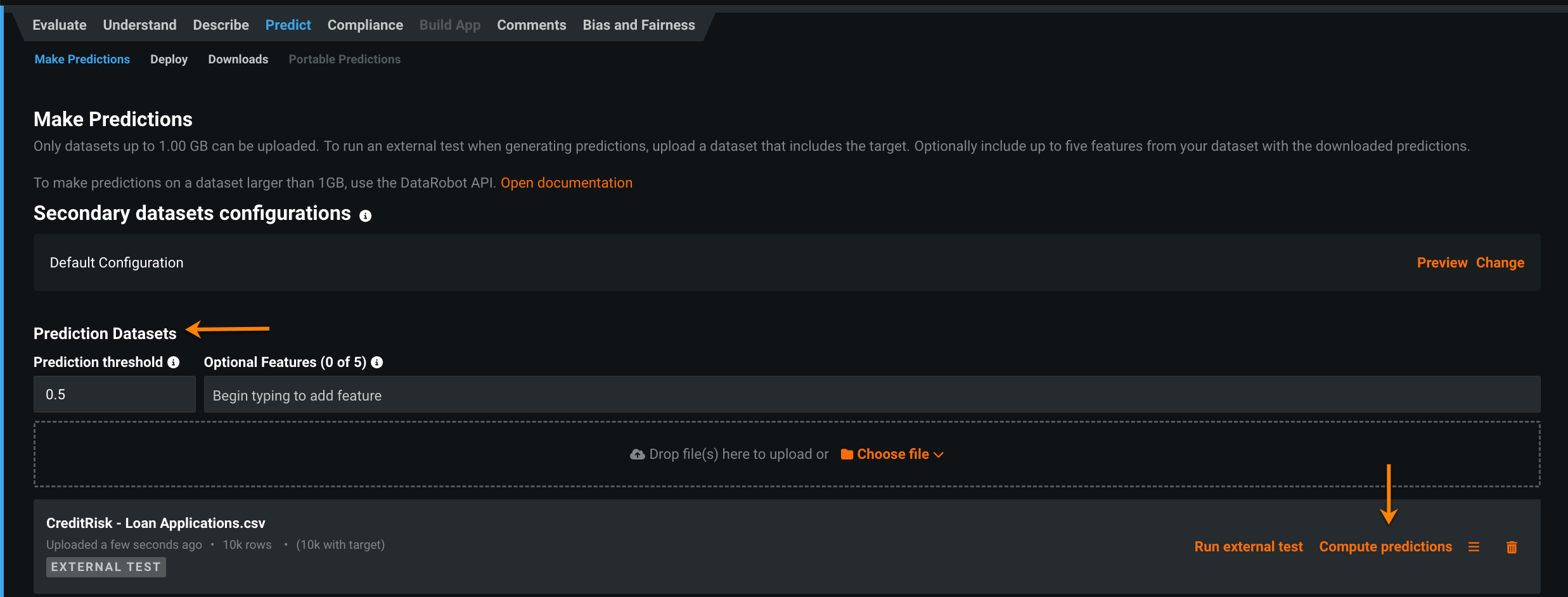 セカンダリーデータセットを置換する必要がある場合は、DataRobotにスコアリングデータセットをアップロードする前に行ってください。 そうでない場合、DataRobotは、デフォルト設定を使用して結合を計算し、特徴量派生を実行します。