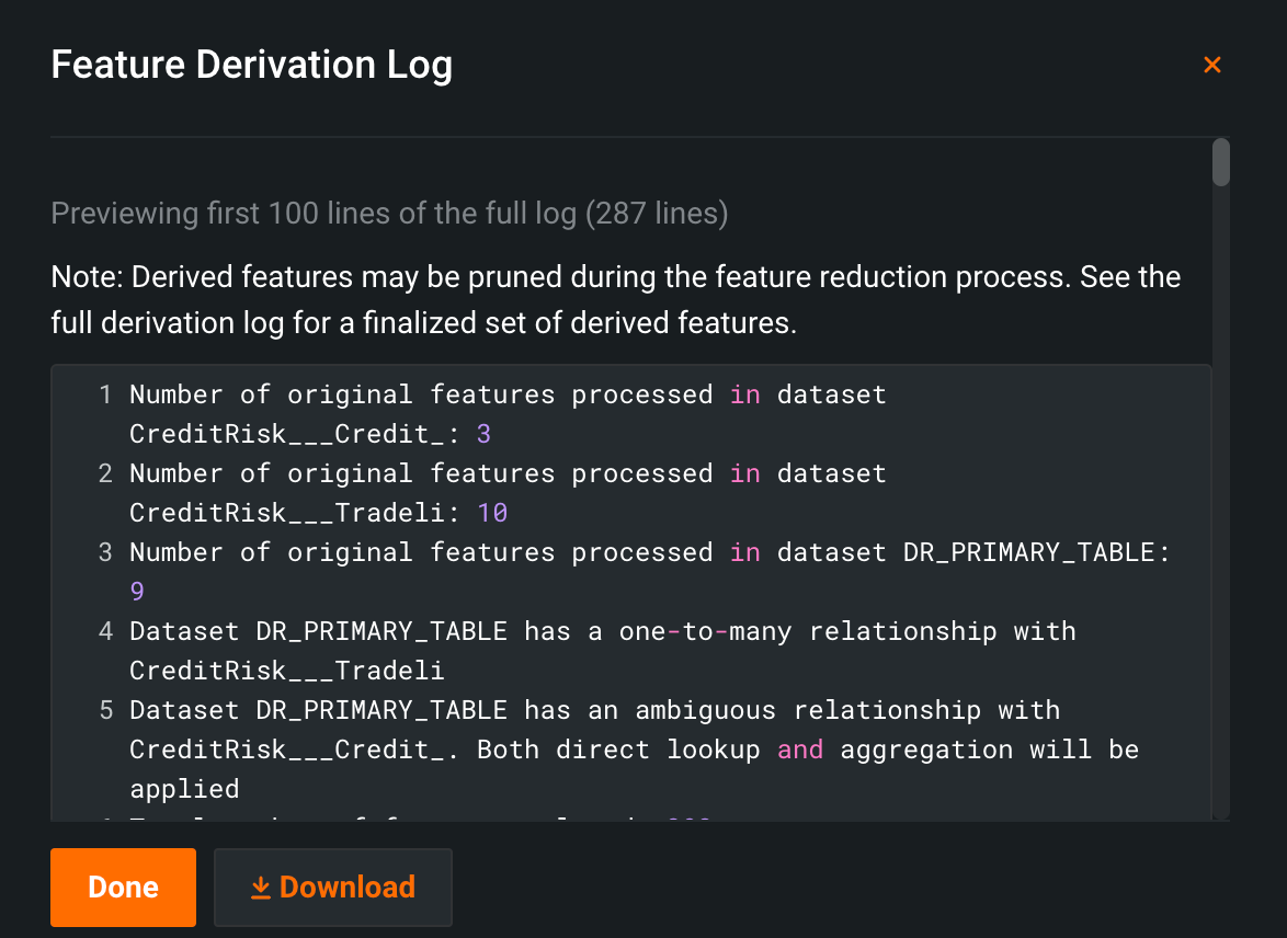 特徴量派生ログには、処理、生成、削除された特徴量に関する情報に加えて、特徴量が削除された理由が表示されます。 必要に応じて、ダウンロードをクリックしてログを保存できます。
