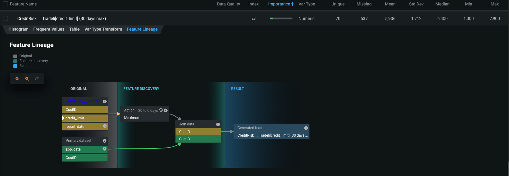 特徴量の系統タブをクリックして、この特徴量がどのように作成されたかを確認します。