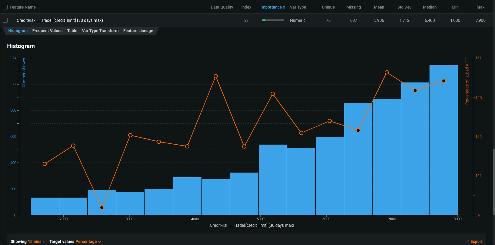 データタブで、派生した特徴量をクリックし、ヒストグラムタブを表示します。
