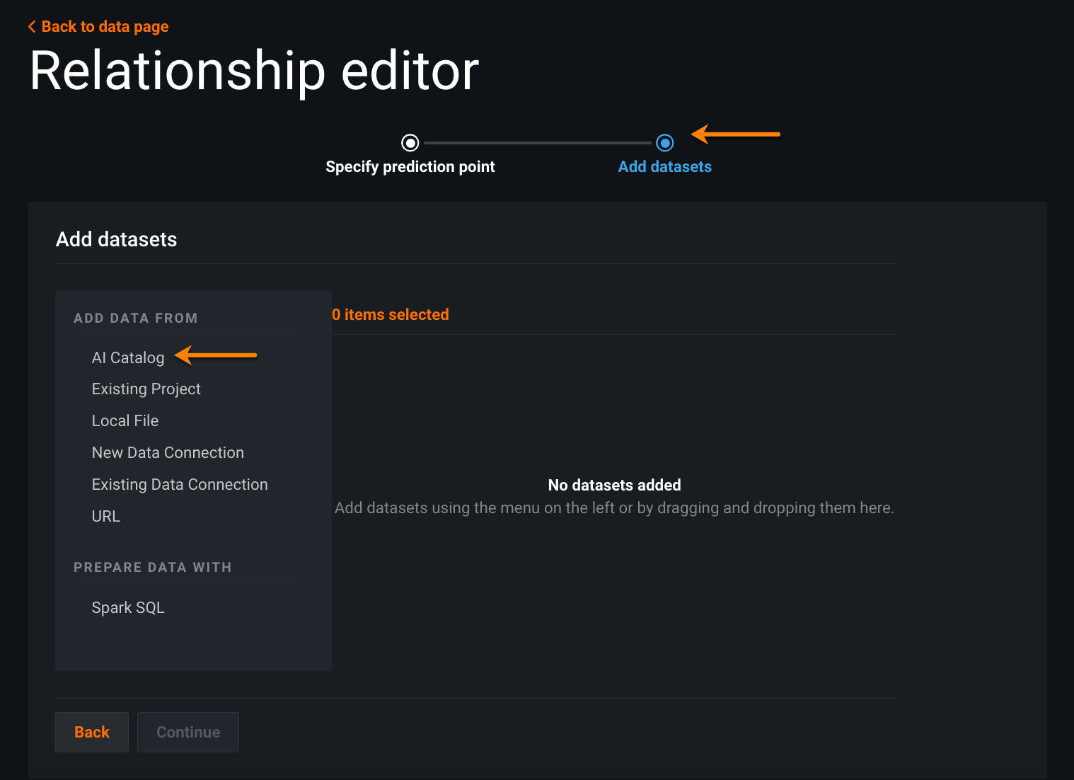 関係性エディターのデータセットを追加ページで、AIカタログを選択します。
