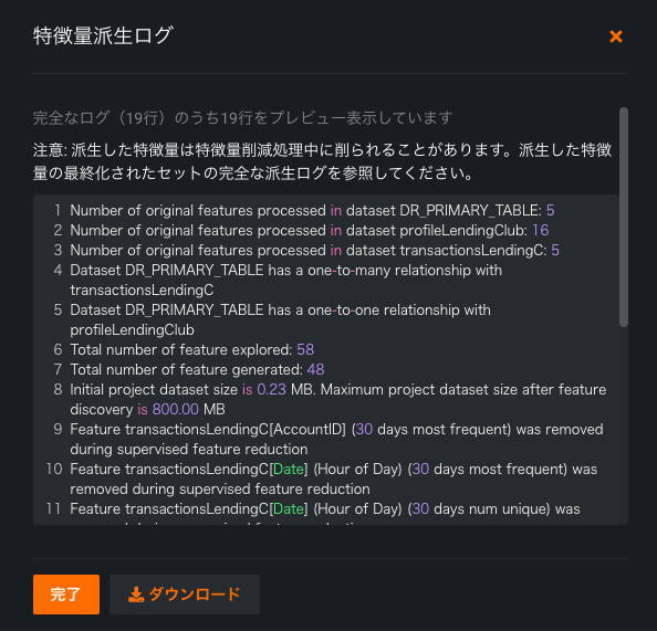特徴量派生ログは、次のことを示します。