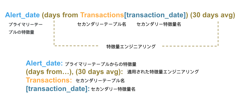 [ ]に示されたセカンダリー特徴量の名前が含まれます。 適用された特徴量エンジニアリングは、丸括弧( )内に追加されます。 -