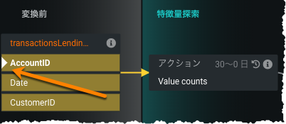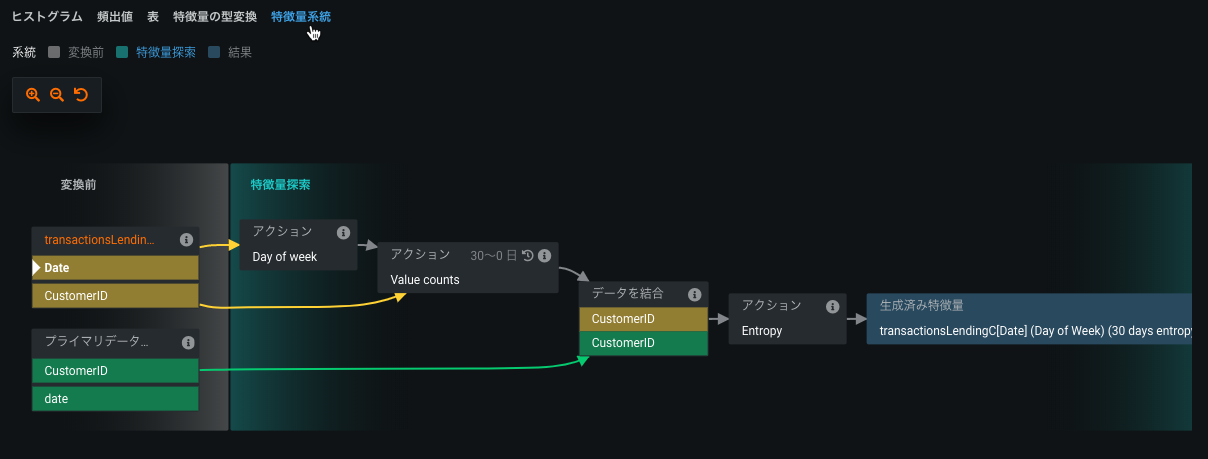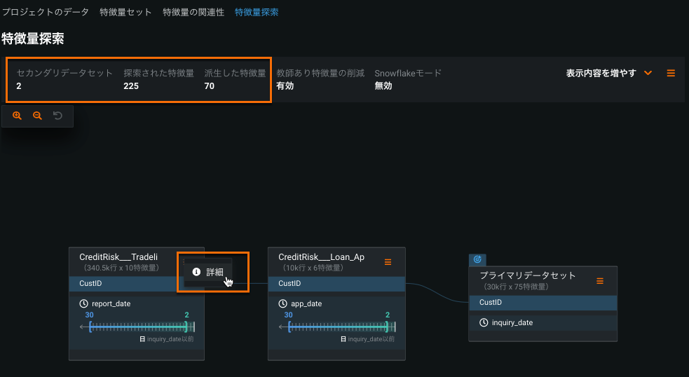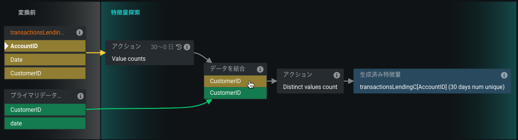 これに対し、黄色のCustomerIDをクリックすると、JOINと結果としての派生した特徴量が示されます。
