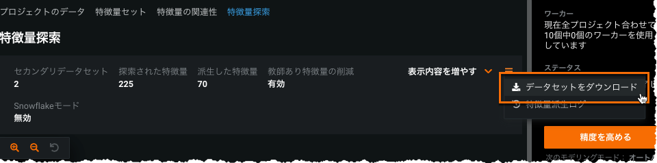 右のメニューで データセットのダウンロードオプションをクリックすると、特徴量探索プロセスにより生成されたデータセットをダウンロードします。つまり、セカンダリーデータセットから派生した多くの新しい特徴量です。