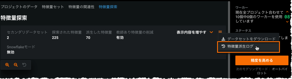 特徴量の生成および削減のプロセスの詳細については、右のメニューで特徴量派生ログオプションをクリックします。