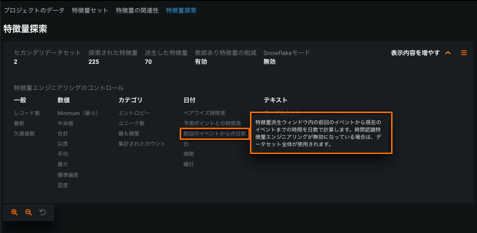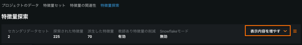 特徴量探索 タブで 詳細表示をクリックすると、特徴量の探索に使用される特徴量エンジニアリングのコントロールが表示されます。