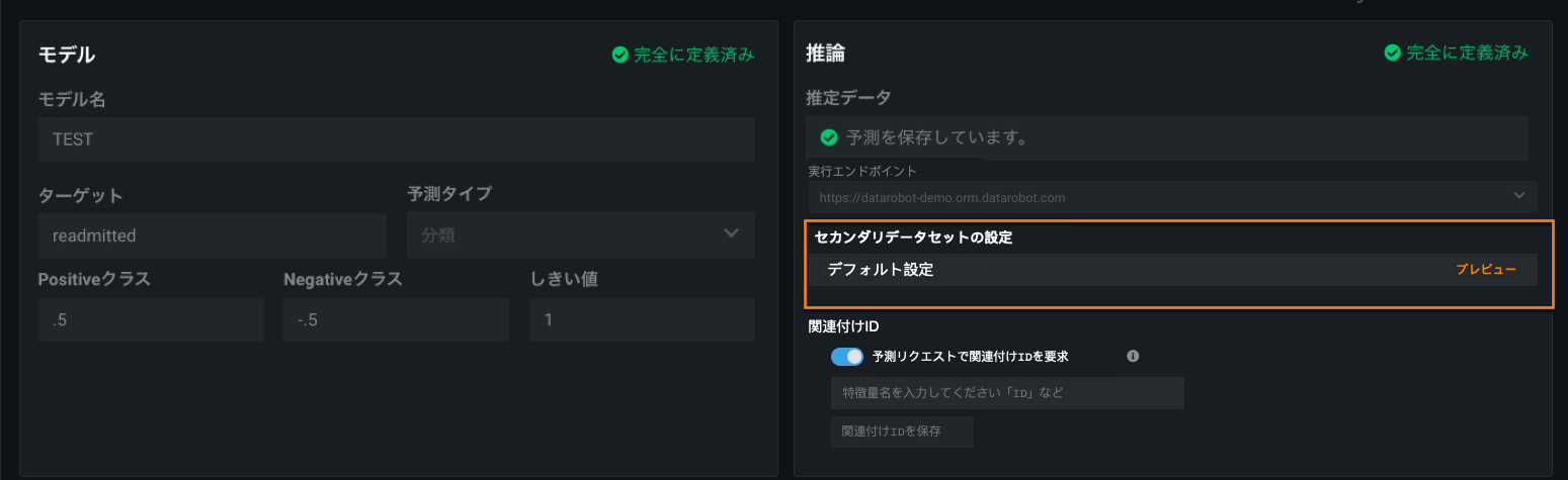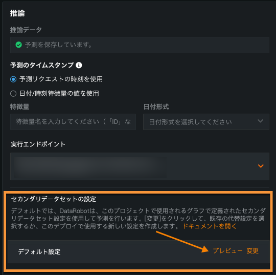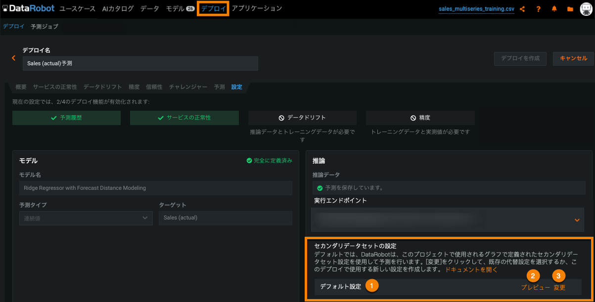 デプロイで使用されるセカンダリデータセット設定は、予測 > 設定タブから表示できます。