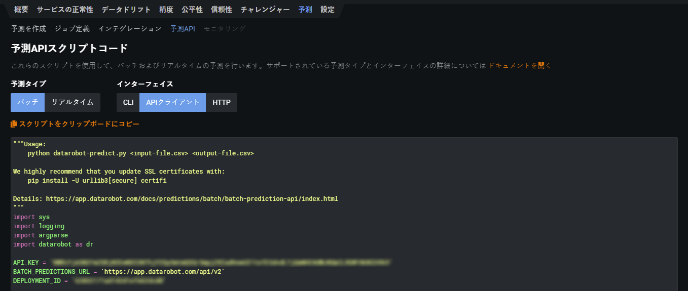 デプロイが完了すると、DataRobotはデプロイページのデプロイの概要ページを開きます。 予測 > 予測APIタブを選択し、バッチとAPIクライアントを選択して、バッチ予測を行うために必要なスニペットにアクセスします。