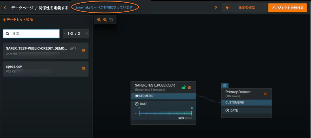 上記の要件が満たされている場合、DataRobotにより連携が自動的に確立され、SnowflakeアイコンとSnowflakeモードが有効になっていますが関係性を定義するページの上部に青く表示されます。