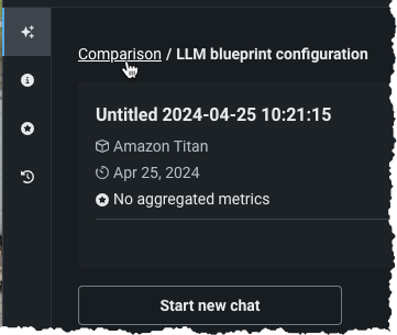 新しいチャットを開始すると、単一のブループリントで複数の独立した会話スレッドを設定できます。 このようにして、回答を「汚染」する可能性のある以前のプロンプト回答の履歴を取り込むことなく、さまざまなタイプのトピックに基づいてLLMブループリントを評価できます。 これは、コンテキストをオフにしてプロンプトを送信し、コンテキストを再度オンにすることで実行できますが、新しいチャットを開始する方がよりシンプルな方法です。