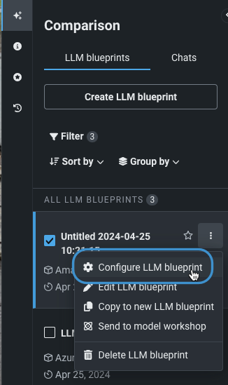 比較を開始した後にさらにチューニングが必要と判断した場合、個々のLLMブループリントの設定を変更できます。