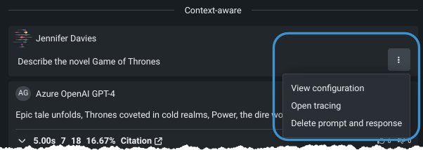 | トレースを開く | トレースログを開きます。このログには、LLMの回答の生成に使用されたすべてのコンポーネントとプロンプティングアクティビティが表示されます。 |